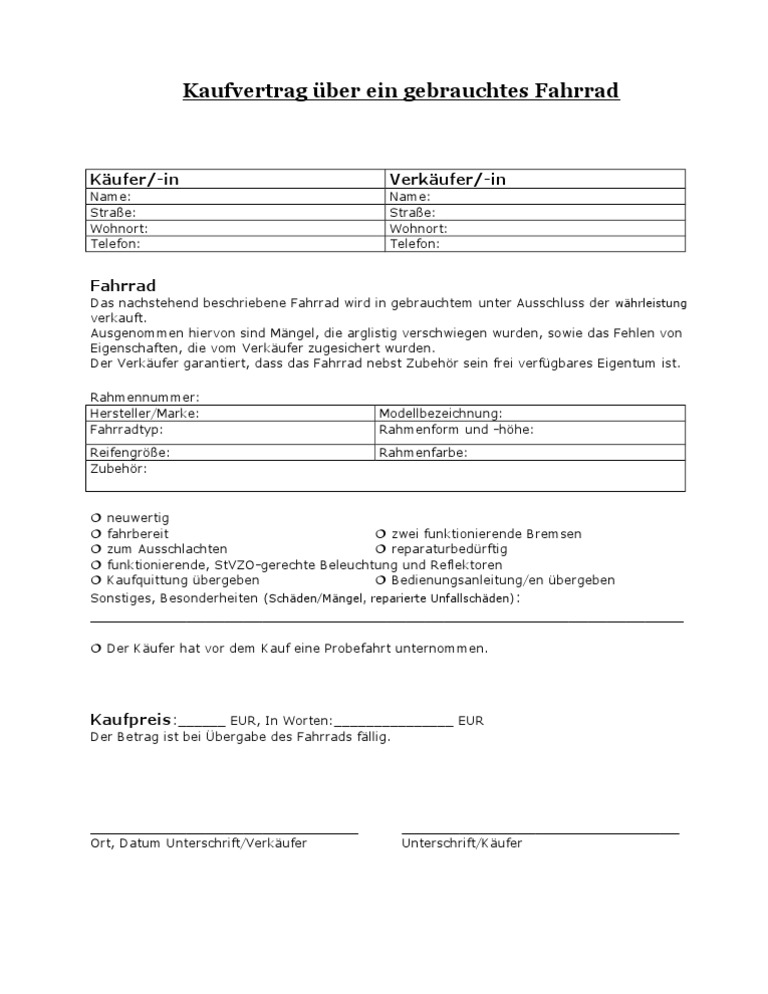 Der kaufvertrag dient dazu dein eigentum am fahrrad nachzuweisen. Sowohl für diejenigen, die ein fahrrad verkaufen, als auch für denjenigen, der das fahrrad kauft. Fahrrad kaufvertrag §2 haftung a) die gewährleistung durch den verkäufer ist ausgeschlossen.